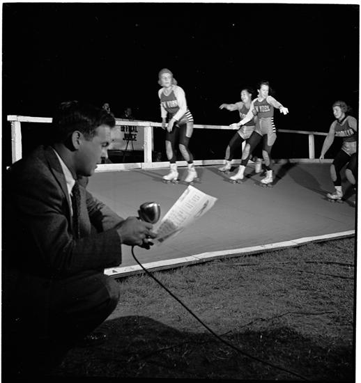 Johnny on the Spot; Johnny Grant's wire-recorded adventures in New York City [Johnny Grant in front of a roller derby track.]