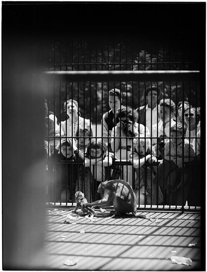 How People Look to Monkeys [Crowd looking at a monkey cage.]