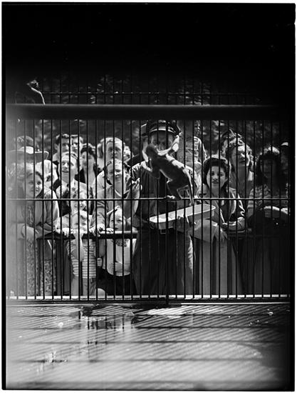 How People Look to Monkeys [Zoo employee feeding monkeys.]