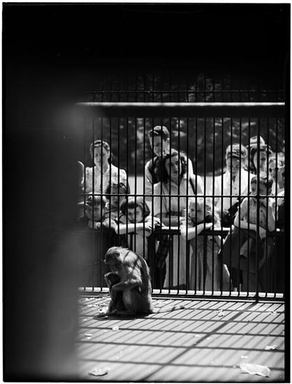 How People Look to Monkeys [Crowd looking at a monkey cage.]
