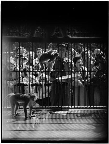 How People Look to Monkeys [Zoo employee feeding monkeys.]