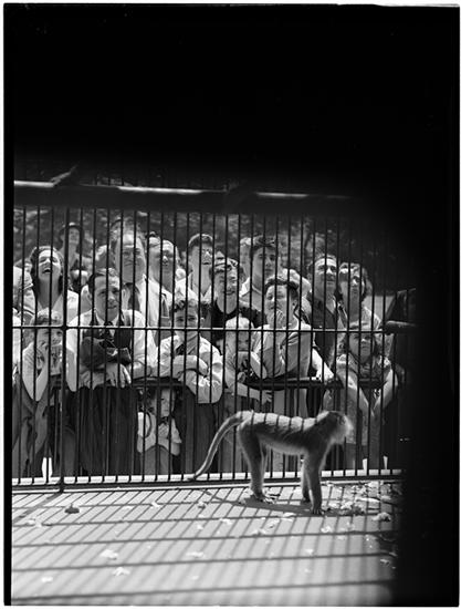 How People Look to Monkeys [Crowd looking at a monkey cage.]