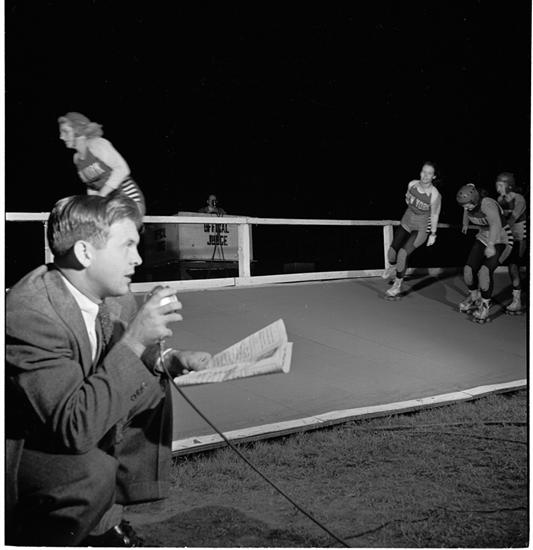 Johnny on the Spot; Johnny Grant's wire-recorded adventures in New York City [Johnny Grant in front of a roller derby track.]