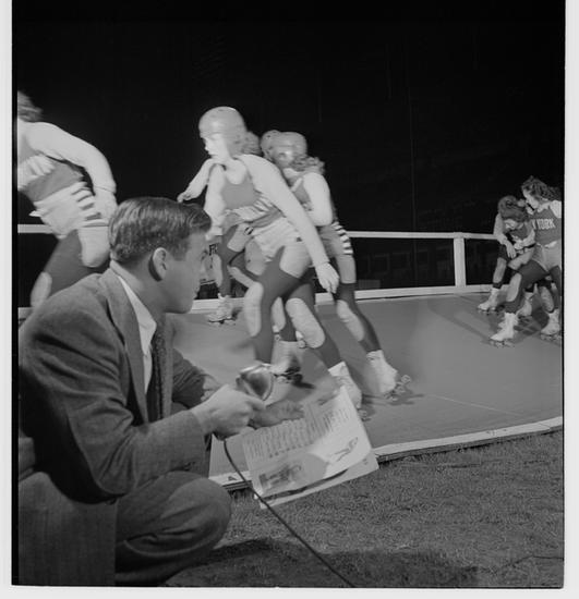 Johnny on the Spot; Johnny Grant's wire-recorded adventures in New York City [Johnny Grant in front of a roller derby track.]