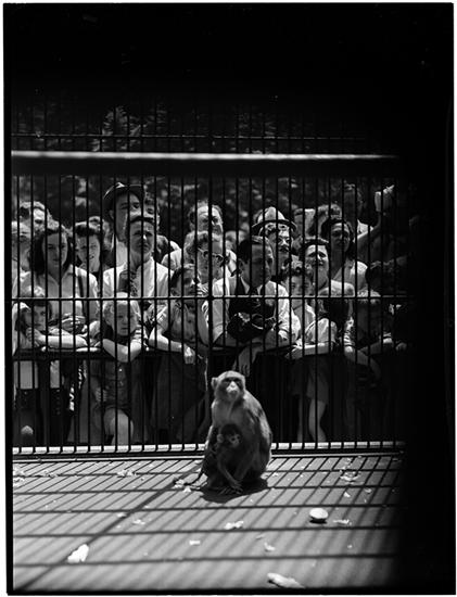 How People Look to Monkeys [Crowd looking at a monkey in a cage.]