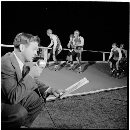 Johnny on the Spot; Johnny Grant's wire-recorded adventures in New York City [Johnny Grant in front of a roller derby track.]