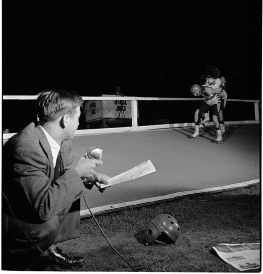 Johnny on the Spot; Johnny Grant's wire-recorded adventures in New York City [Johnny Grant in front of a roller derby track.]