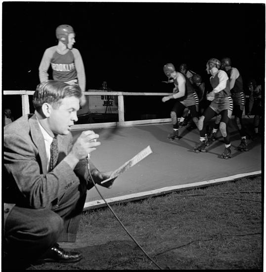 Johnny on the Spot; Johnny Grant's wire-recorded adventures in New York City [Johnny Grant in front of a roller derby track.]