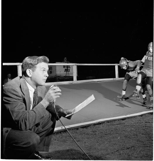 Johnny on the Spot; Johnny Grant's wire-recorded adventures in New York City [Johnny Grant in front of a roller derby track.]