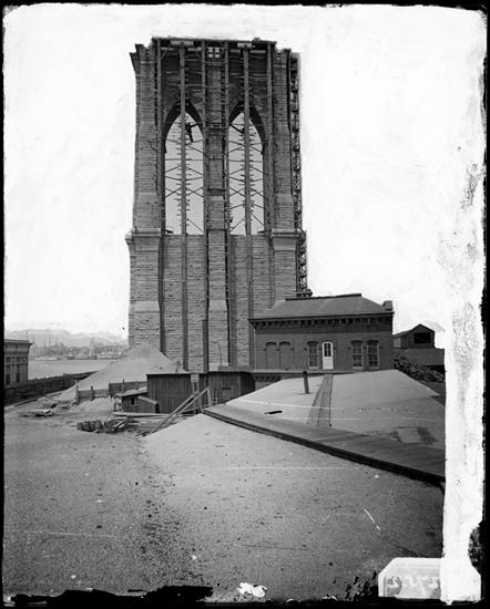[Brooklyn Bridge Tower under construction.]
