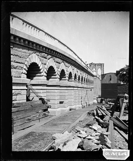[Cityscape with Brooklyn Bridge under construction in the background.]