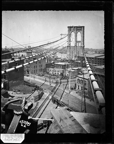 [Cityscape with Brooklyn Bridge under construction in the background.]