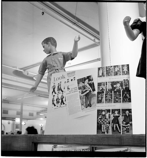 Macy's [Mannequins dressed in children's clothes surrounded by magazine advertisements from LOOK Magazine.]