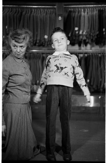Clothes of Schoolchildren [Boy trying on outfits in a clothing store.]