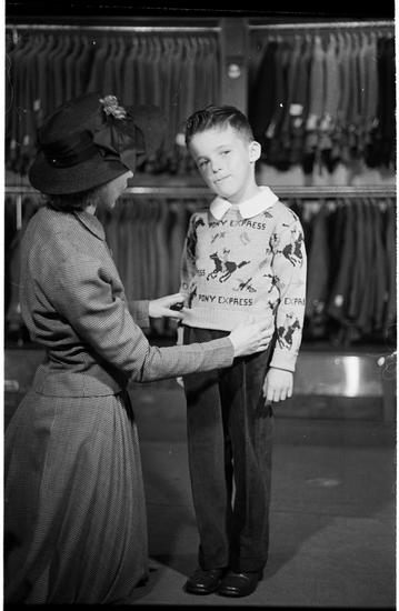 Clothes of Schoolchildren [Boy trying on a coat in a clothing store.]