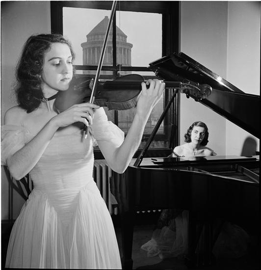 Two Sisters [One sister sits at a piano and another plays a violin.]