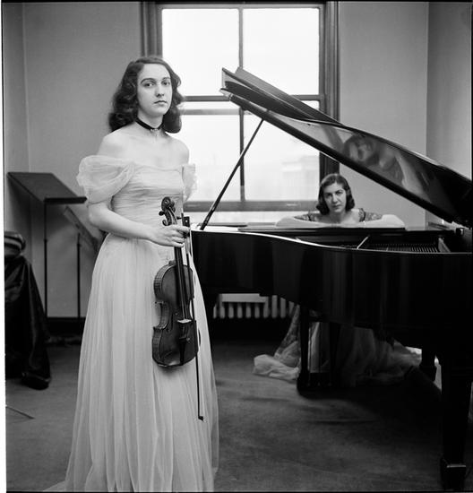 Two Sisters [One sister sits at a piano and another stands with a violin.]