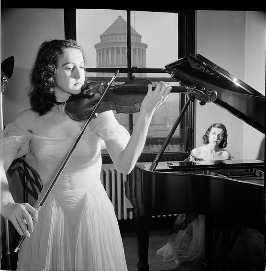 Two Sisters [One sister sits at a piano and another plays a violin.]
