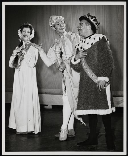 [Jack Gilford as The King Sextimus, Joe Bova as Prince Dauntless and Carol Burnett as Princess Winnifred in "Once Upon a Mattress".]