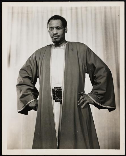 [Paul Robeson in the title role, Uta Hagen as Desdemona and Philip Huston as Lodovico in "Othello".]