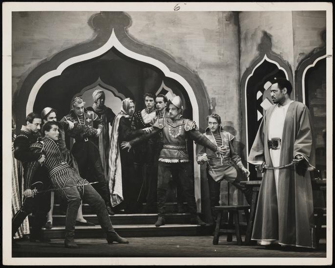 [Paul Robeson in the title role, Uta Hagen as Desdemona and Philip Huston as Lodovico in "Othello".]