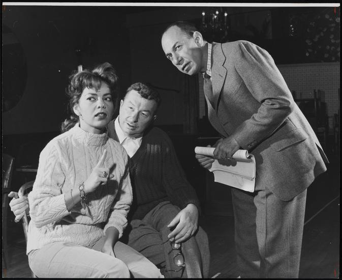 [Abbe Lane as Bobo, Tony Randall as Captain Henry St. James and Jacquelyn McKeever as Mrs. Maud St. James in "Oh Captain!".]