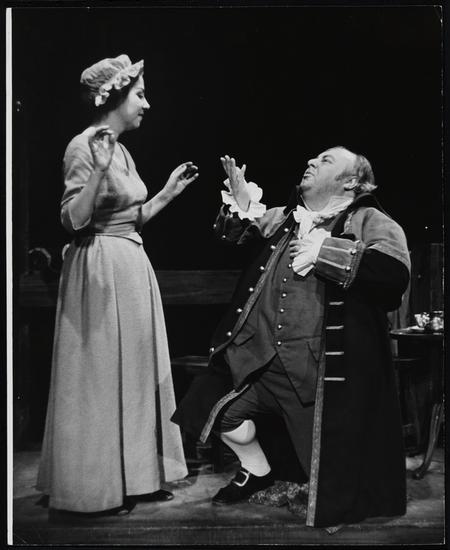 [Willoughby Goddard as Mr. Bumble (the Beadle) and Hope Jackman as Mrs. Corney (the Matron) in "Oliver!".]