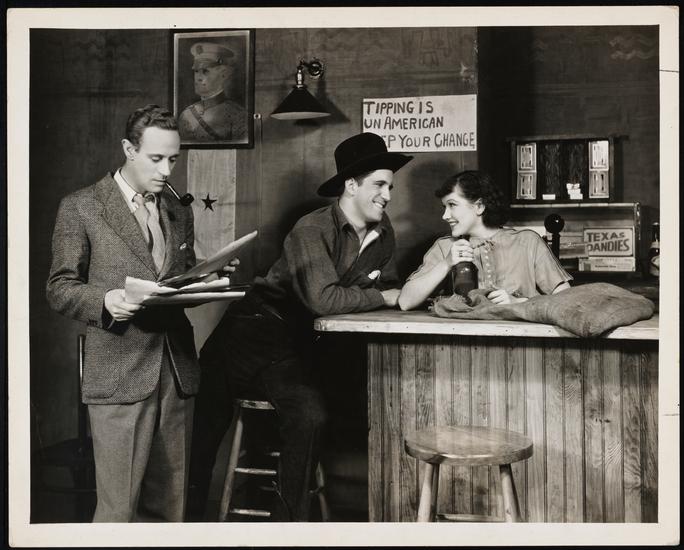 [Leslie Howard as Alan Squier, Peggy Conklin as Gabby Maple and Charles Dow Clark as Gramp Maple in "The Petrified Forest".]
