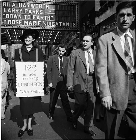 Advertising Sandwich Board [Woman wearing a sandwich board advertising the 1-2-3 cafe.]