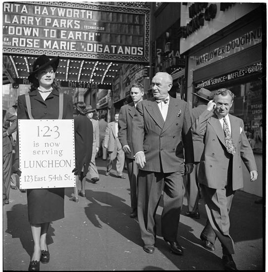 Advertising Sandwich Board [Woman wearing a sandwich board advertising the 1-2-3 cafe.]
