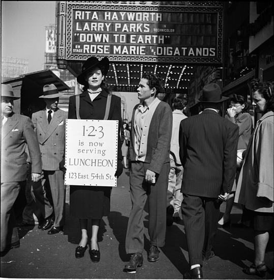 Advertising Sandwich Board [Woman wearing a sandwich board advertising the 1-2-3 cafe.]