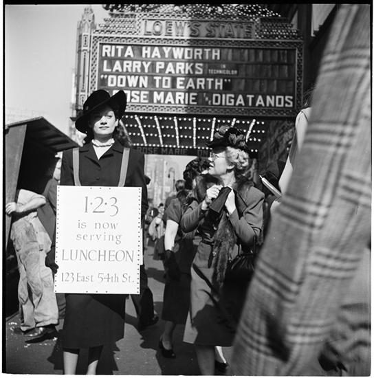 Advertising Sandwich Board [Woman wearing a sandwich board advertising the 1-2-3 cafe.]