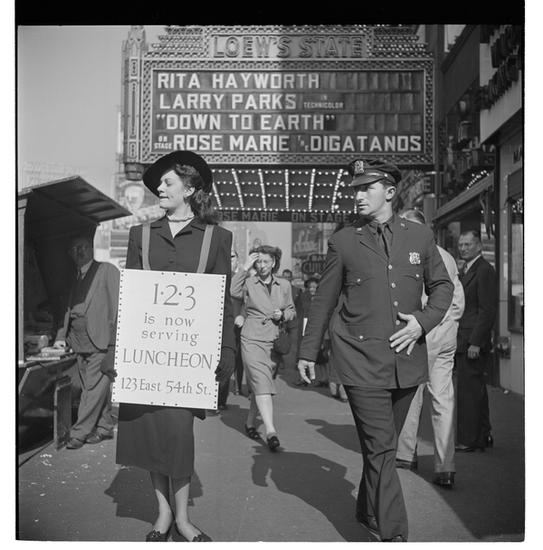 Advertising Sandwich Board [Woman wearing a sandwich board advertising the 1-2-3 cafe.]