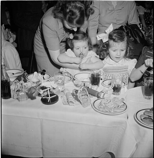 United Nations Children's Party [Children eating, one has climbed under the table.]