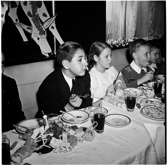 United Nations Children's Party [Children eating, one has climbed under the table.]