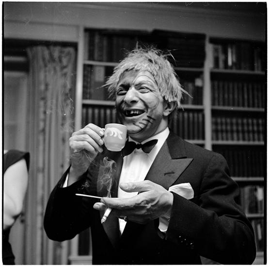 Beaux Arts Ball [Man, wearing makeup, drinking coffee at a costume party for members of the Architectural League of New York.]