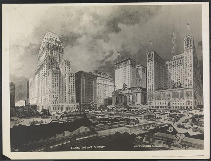 Hotels Murray Hill, Belmont, Manhattan, Biltmore and Commodore, Copy, Louis Biedermann's drawing of Pershing Sqr. Hotels, Subways and Grand Central.
