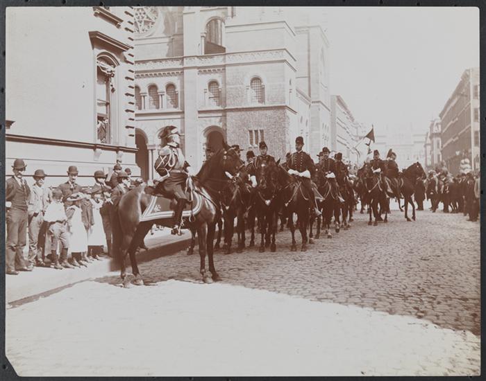 Street Scenes - 1894. 43rd Street - East from 5th Ave. Grand Central in Background, Temple Emanu El on Left. Gov. Morton's Staff. John Jacob Astor Leading.