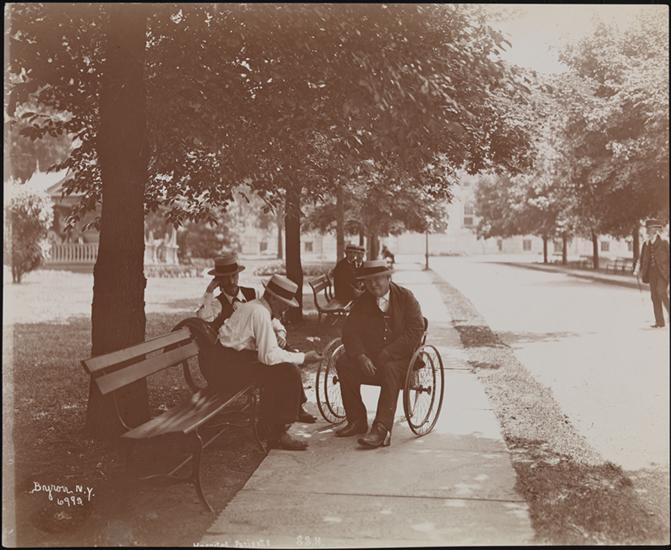 Men, one in a wheelchair, seated at a bench at Sailor's Snug Harbor, a facility and home for retired sailors on Staten Island, New York.