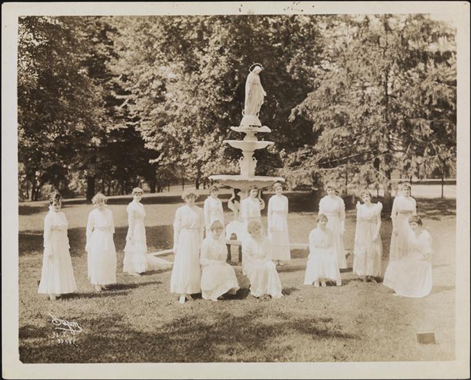 Class of female students posed on a lawn in front of a Virgin Mary fountain at the Academy of Mount St. Vincent, Riverdale.