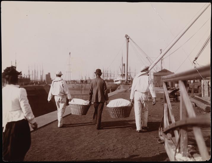 The crew of the "Valkyrie" walking down the pier, carrying the day's wash.