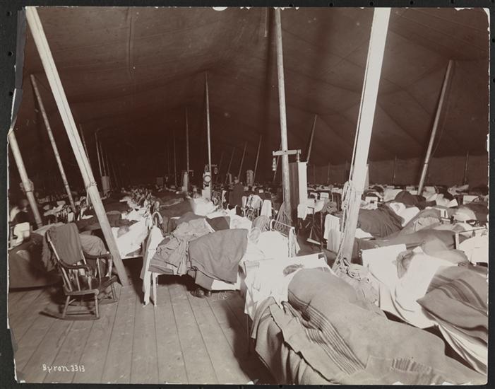 Description Patients sleeping on beds in a large tent on Welfare (previously Blackwell's, now Roosevelt) Island.