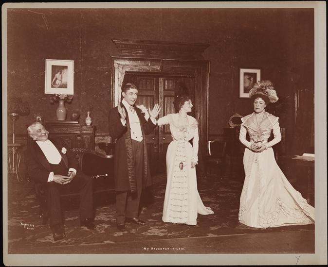A scene from the New York production of Fabrice Carre and Paul Bilhaud's play "My Daughter-In-Law," featuring the Charles Frohman London Comedians including Herbert Standing, Seymour Hicks, Ferdinand Gottschalk, Fannie Brough, Josephine Gautier, and Ellaline Terriss.