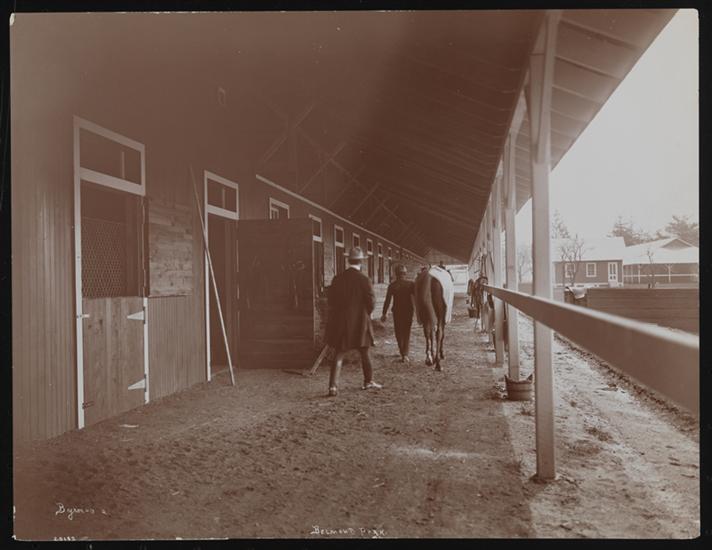 Two men and a horse at the stables at Belmont Park Race Track, Elmont N.Y.