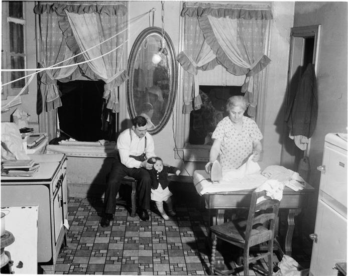 Kitchen Interior, Woman Ironing and Man with Small Child