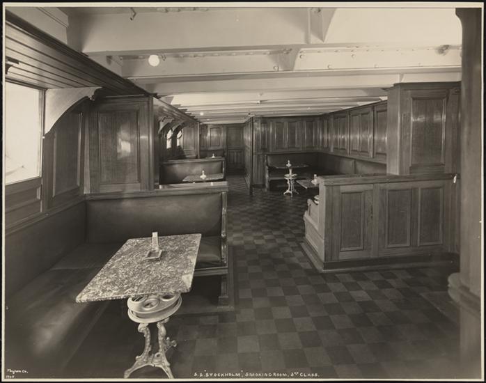 Swedish American Line, S.S. "Stockholm", Interior, Cabin Smoking Room Looking Astern from Starboard.