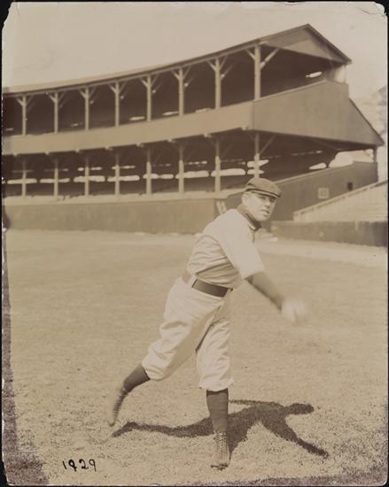 A male athlete throwing a baseball on the field of the New York Polo Grounds.