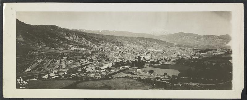 Aerial view of a city with snow-capped mountains beyond.
