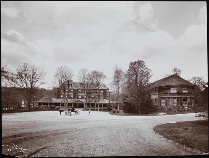 A horse and buggy on the driveway of the Tuxedo Club, Tuxedo Park, N.Y.