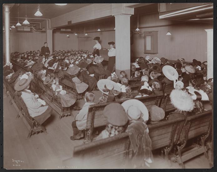 Young girls and boys sitting on benches in a room at St. Thomas' Chapel (Protestant Episcopal) at 230 East 60th Street with attention focused on two women at front of room.